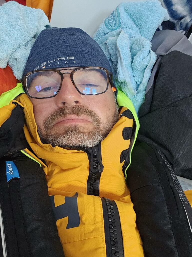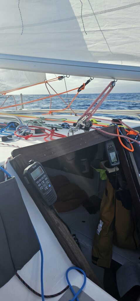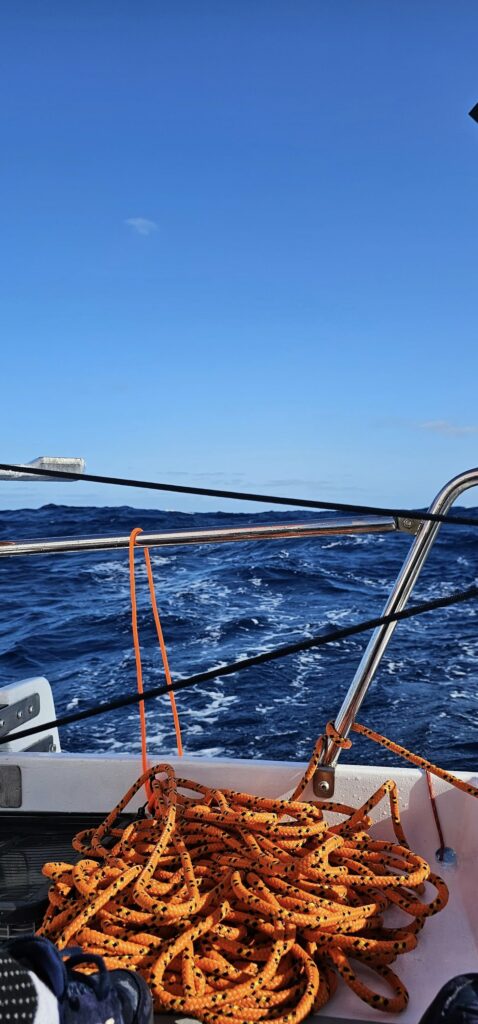 Następny dzień to mokry dzień. Tak mokry, tak chlapie, tak woda do łódki wchodzi, że ręce mam jakbym w wannie ze dwie godziny przesiedział. Mam dość lekko i sił trochę brakuje na zabawę żaglami. Zostaję na samym foku do końca dnia. Linę tylko wyciągnąłem. Gapię się, odbudowuję się i jem. Pomarańcze przed myciem zębów. Znów zaraz ciemno, a ja dostaję info, że jestem leszczu i mam ze 20 mil do ostatniego. Nie przyjechałem się ścigać. Jedyny facet, z którym chciałem się zmierzyć to ja sam. Ale wnerwiło mnie kapkę. Co jest ze mną nie tak!