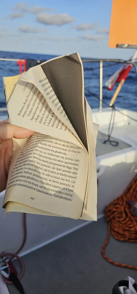 Kolejny dzień, coraz bardziej na południe. Zachód słońca też przesuwa się i jest ponad godzinę później niż na początku. W nocy coś grzebałem w bakistach dziobowych, po zupę żeby sobie zagrzać i zjeść, zupę gorącą przynajmniej dobrą. Namacałem zupę w worku, w bakiście ale namacałem też, że mam tam mokro. Co jeszcze… Od razu sprawdzam czy nie słone. Nie słone czyli dobrze. Znaczy słodkie ale nie w sensie, że woda słodka (znaczy też dobrze bo zapas wody cały). Został gdzieś jakiś wkręt nieobcięty i butelka gazowanego słodkiego pomarańczowego ulepka rozszczelniła się i wyciekła. Tam też wepchnieta była akurat, nie w worku, ksiązka którą kupiłem sobie na rejs. Popiła sobie tęgo tego narańcza cuda i zrobiła się dwa razy grubsza i trzy razy cięższa. Nie do odratowania. Okładka od razu odlazła, a w rękach została mi tylko kupka kompletnie przemoczonych, napuchniętych kartek. A tak chciałem to przeczyać, taki reportarz o Rosji i sekcie założonej w latach 90 przez milicjanta, który nagle zrozumiał jadąc trolejbusem, że jest Chrystusem. Szykuj sanie latem. Przeczytałem pierwszą stronę z tej mokrej kupki i zaciekawiony postarałem się jakoś na rogu, jakoś odkleić tą kartkę jakoś delikatnie żeby się nie podarła i przeczytałem jej drugą stronę. Wyrzuciłem to za burtę i czytam dalej. I tak kartka po kartce, moja książka znikała w falach oceanu. Na koniec dnia w ręku nie zostało mi nic. Po przeczytaniu książki przestałem ją posiadać. Cały dzień się czytało, się jadło, się żeglowało. Samo. Prawie nie dotknąłem rumpla czy żagli. To był dobry odbudowujący dzień. W nocy jeszcze trochę walczę o wynik ale i tak jestem ostatni. Grzeję zupę w podgrzewaczu chemicznym. Znów są gwiazdy, znów się gapię. Leżę w kokpicie prawie całą noc. Sztormiak, polar dają radę. Szkoda jednak, że gumowców nie wziąłem…